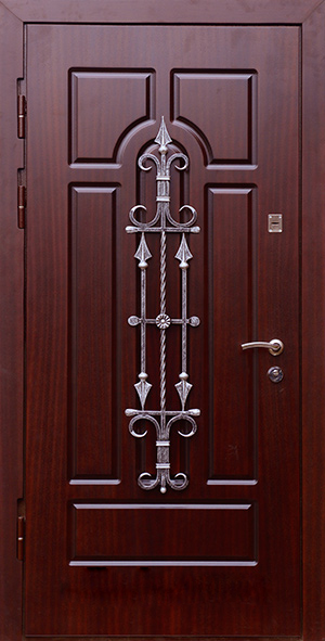 Красивый внешний вид немаловажное, но не самое главное преимущество металлических дверей с элементами ковки. Такие двери еще и очень надежны. Они изготавливаются из холоднокатаной стали толщиной 1,4-2 мм, отделываются массивом, корабельной фанерой, натуральным шпоном или МДФ-панелями, покрытыми виноритом. Установив на нее замки 3 или 4 класса взломостойкости, вы получите дверь, вскрыть которую с помощью грубой силы практически невозможно.